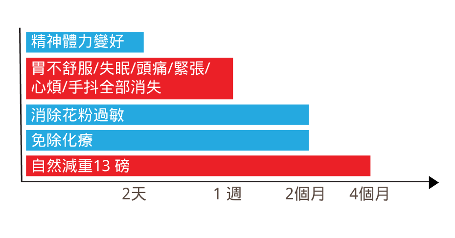 3個星期吃水果不癢了;1個月,皮膚過敏症狀消失,早上起床精神體力變好!8年半的花粉過敏,如今在嚴重的花粉季節也無任何過敏症狀,連肚腩、胃腩都減去了,精神體力明顯改善!