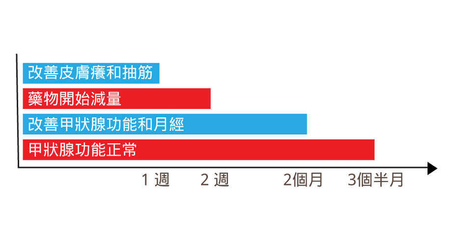 14歲自體免疫性急性甲亢,每天需要吃大量的甲亢藥和心血管的藥,即使如此,心跳還是每分鐘超過90下,月經不調,以及其它的身體狀況。調理2天,眼乾和眼凸的情況沒那麼嚴重了,1個星期後皮膚癢和每晚抽筋的情況也改善了,2週後醫生的藥量開始減量,1個月藥量減至一天一顆還可以保持穩定的狀況,2個月檢查甲狀腺功能有了極大的改善,月經不調也改善了,3個半月檢查甲狀腺功能完全恢復正常,不用吃藥了!