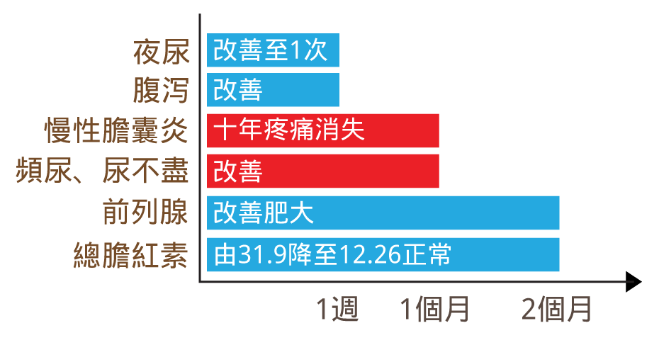1週後夜尿明顯改善到1次,每天1-2次的腹瀉也消失了,臉色明顯紅潤;1個月後,長達十年慢性膽囊炎引起的疼痛不再痛,頻尿和尿不盡的現象也消失了;2個月後體檢總膽紅素由31.9恢復到正常12.26,直接膽紅素由9.7降至3.07,間接膽紅素由22.2降至9.2,更可喜的是,前列腺肥大由之前的5.37cm*4.49cm*3.74cm改善到4.5cm*3.5cm*3.3cm