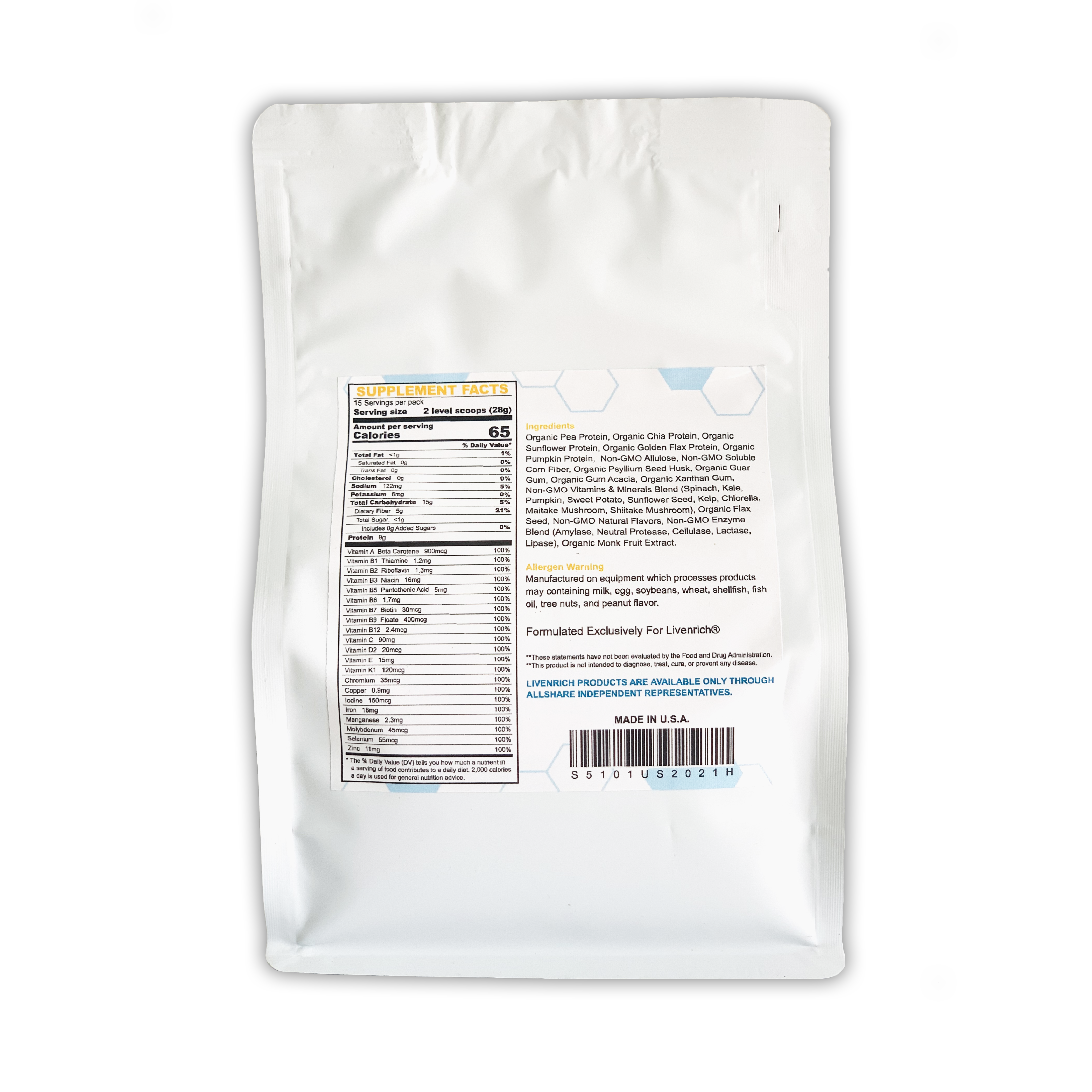 全天然均衡營養粉集合多種有機植物蛋白,包括有機豌豆蛋白、有機奇亞籽蛋白、有機亞麻籽蛋白,有機葵花籽蛋白,和有機南瓜籽蛋白。這些基於植物的蛋白粉的混合構成理想比例的所有必需氨基酸,是高質量的蛋白質;在低溫下仔細生產,保護益生菌和活性酶,因此是高度易消化的蛋白質。同時,力齊全天然均衡營養粉去除脂肪組成,富含多種膳食纖維,並且不含常見的食物過敏原,如乳糖、麩質和大豆,全素或奶素素食者均可食用。