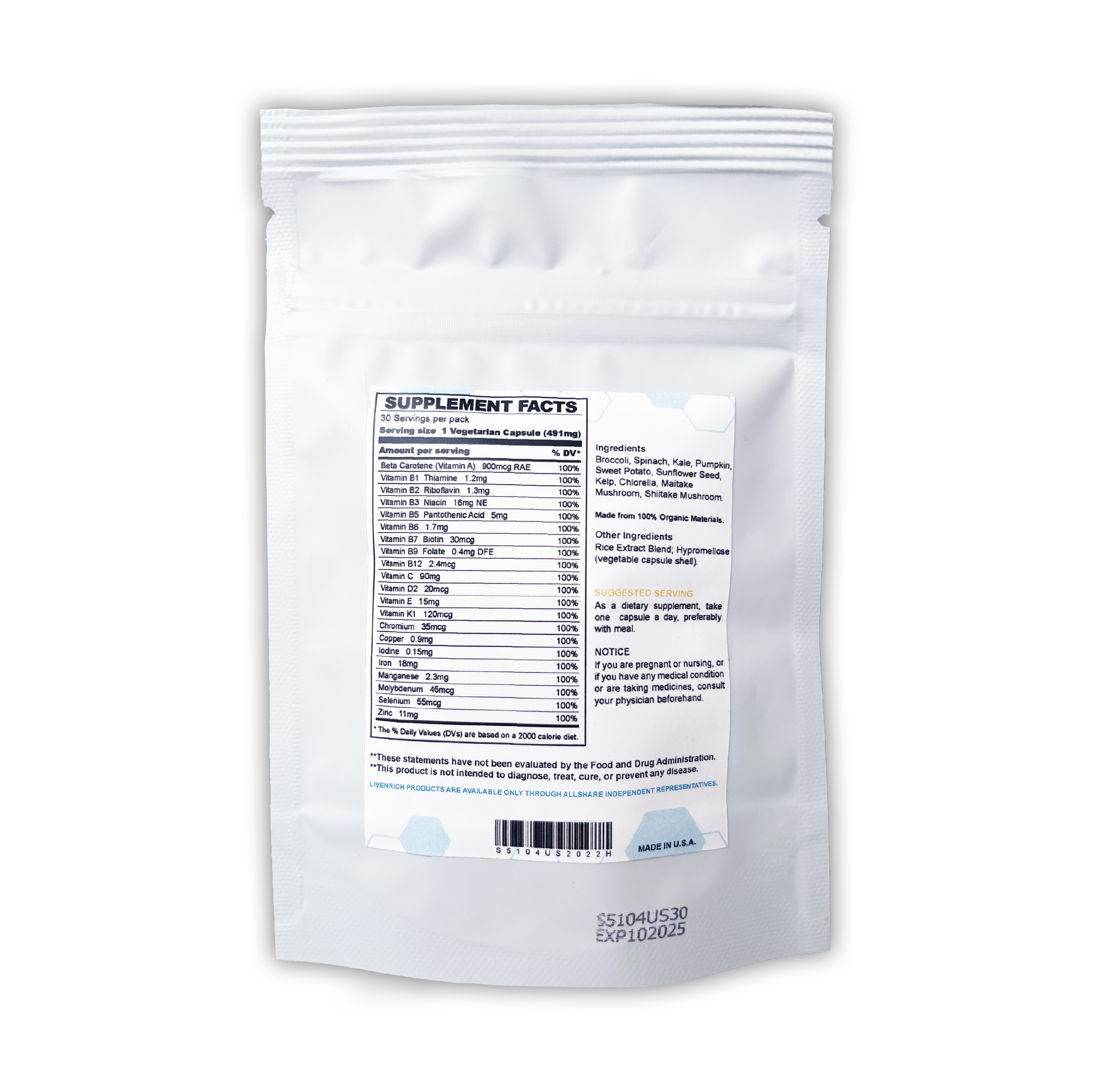 全天然維生素礦物質是來自100%有機蔬菜西蘭花,菠菜,羽衣甘藍,南瓜,甘藷,葵花籽,海帶,小球藻,舞茸,香菇,有助於支持維生素的穩定性和活性,可更快更容易地吸收到體內,而且對胃的刺激很小甚至沒有。